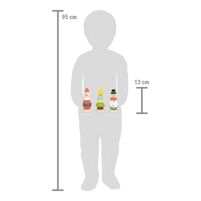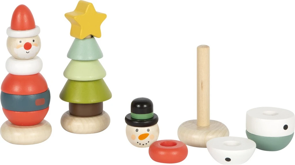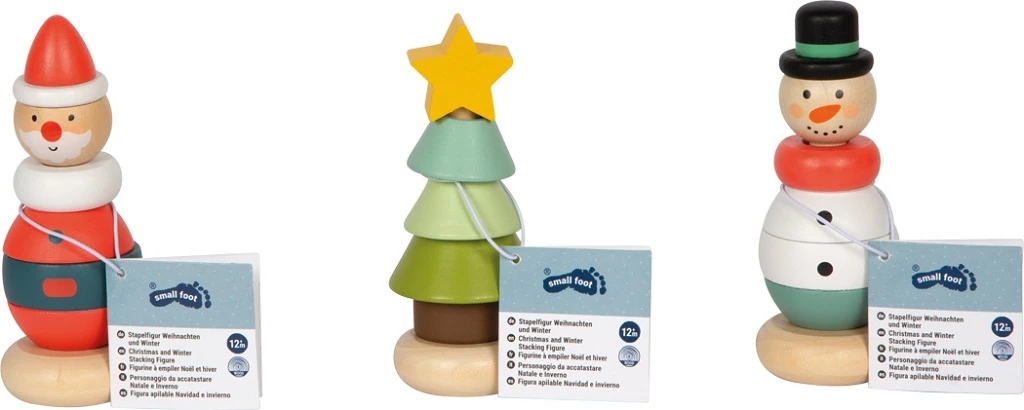 Se sněhulákem, vánočním stromečkem a Santa Clausem bude skládání během adventního období ještě kouzelnější. Tyto dřevěné vánoční figurky se skládají z 5 barevných dílků, které se snadno zasouvají a skládají na sebe. Každá stohovací figurka je vyrobena z kvalitního dřeva a zdobena veselým, přátelským motivem.