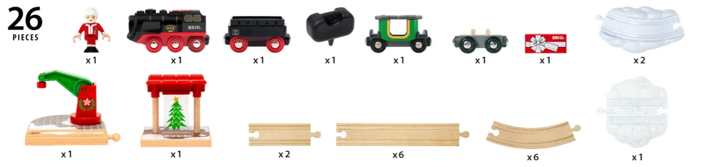 Sada obsahuje 27 dílů včetně parní lokomotivy na baterie, zásobníku vody, dvou vagónků, jeřábu, polárního nádraží, zasněžených a dřevěných kolejnic, figurky Santu i označení Severního pólu.