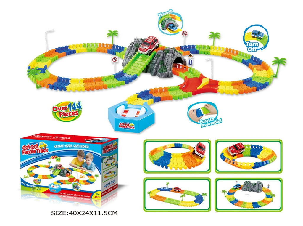 Dráha obsahuje 144 dílů, které lze snadno spojovat a tvarovat do různých tras. Součástí balení je také tunel, doplňky a jedno autíčko – k dispozici ve variantě červené nebo modré.