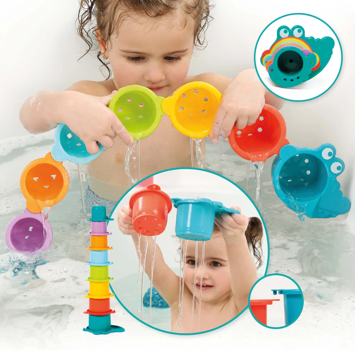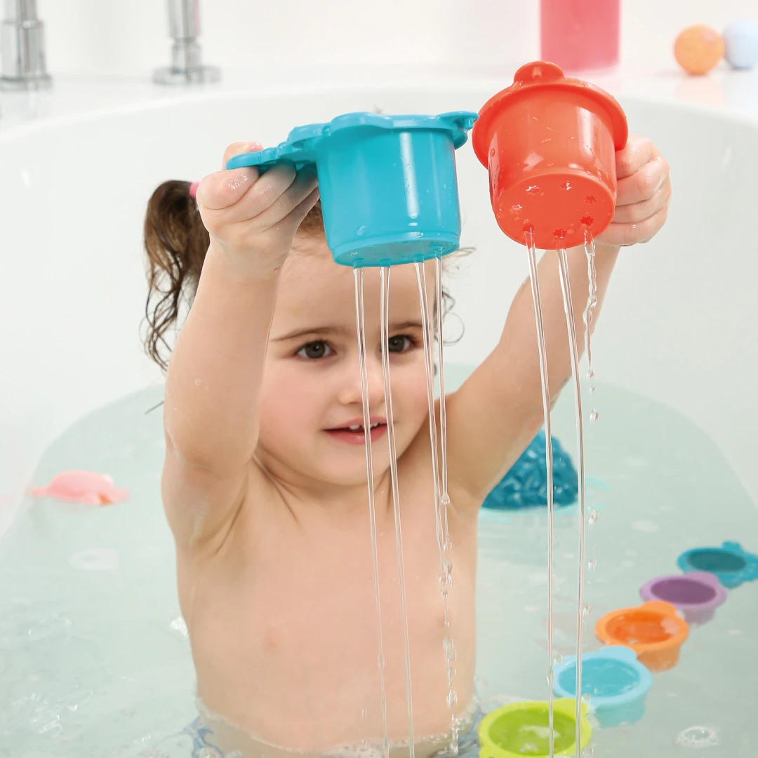 Zábavu doplňuje stříkací krab, lodička a krokodýl se sadou 8 stohovatelných kelímků, ideálních pro vodní experimenty a efekty deště