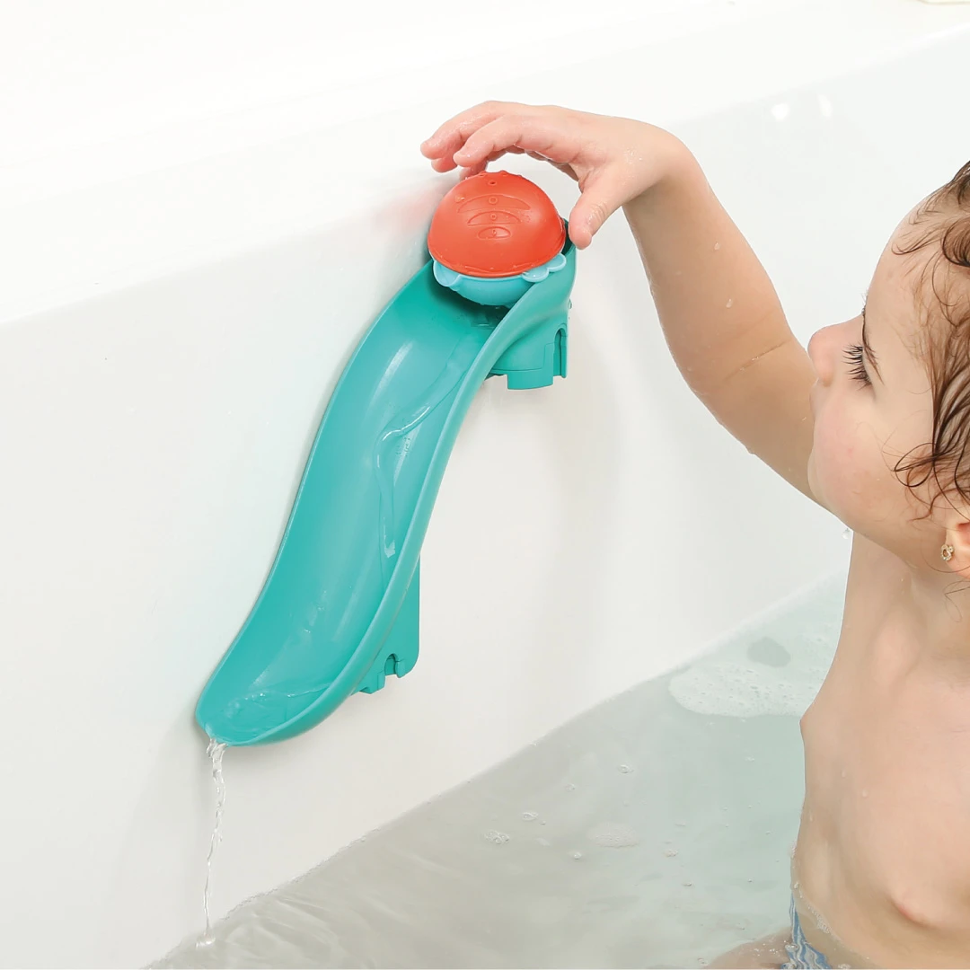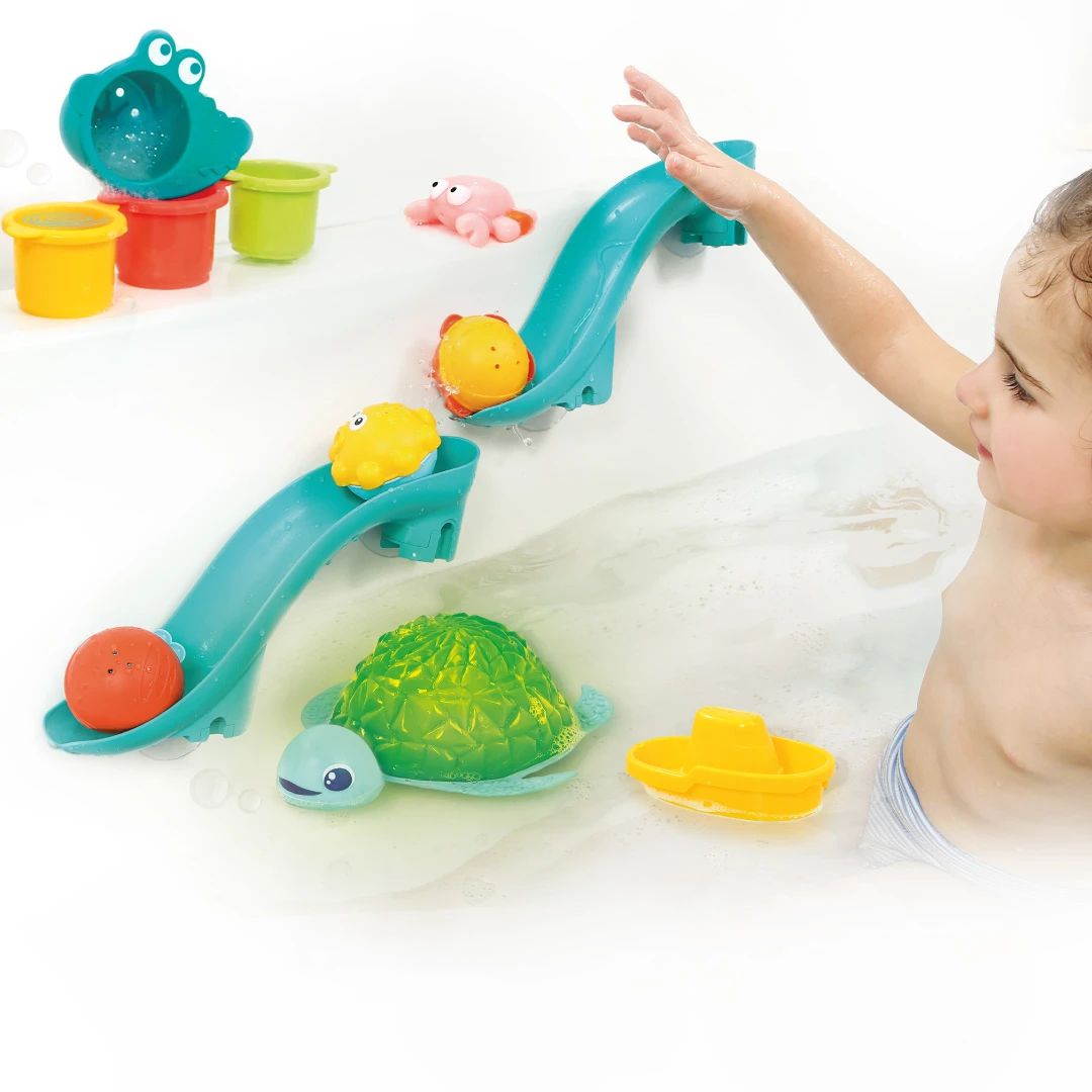 Vodní skluzavky a míčky - dvě odnímatelné skluzavky s přísavkami můžete upevnit na vanu nebo obklady – vytvoříte tak jedinečnou vodní dráhu pro tři míčky