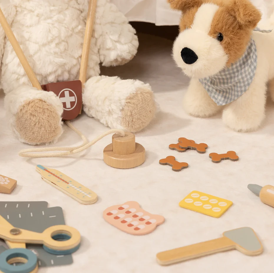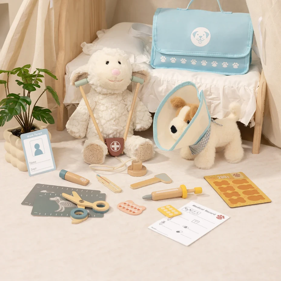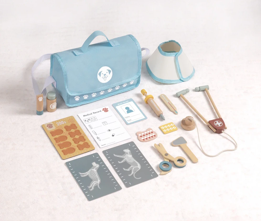 - 16 kusů vybavení, které umožňují dítěti hrát si na veterináře kdekoliv — sada obsahuje praktickou tašku na nošení.