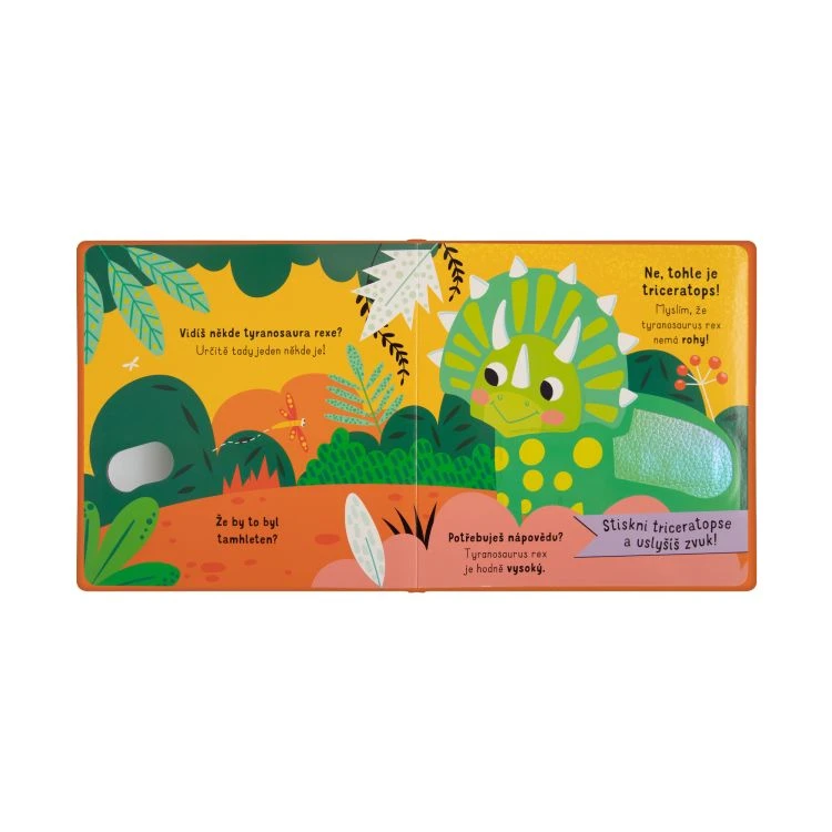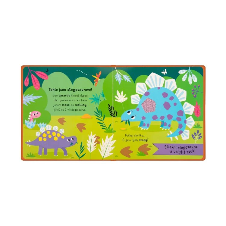 Na každé stránce si mohou malí čtenáři sáhnout na dinosaura – v knížce si tak mohou pohladit triceratopse, brachiosaura, spinosaura, ankylosaura, stegosaura i tyranosaura rexe.