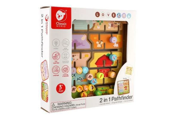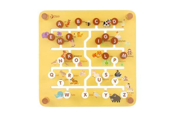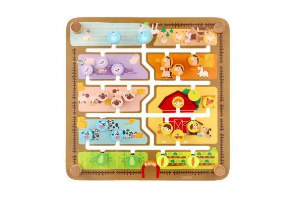 Oboustranná dřevěná deska, na které jsou z jedné strany zvířátka z farmy a vkládací kolíky (zvířátka, obličeje, ovoce), které po desce vedete labyrintem na správné místo. Z druhé strany jsou obrázky zvířátek, k jejichž názvu musíte labyrintem dovést kolík se správným počátečním písmenem, vytvoříte tak abecedu (názvy zvířátek jsou v angličtině).