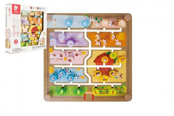 Oboustranná dřevěná deska, na které jsou z jedné strany zvířátka z farmy a vkládací kolíky (zvířátka, obličeje, ovoce), které po desce vedete labyrintem na správné místo.