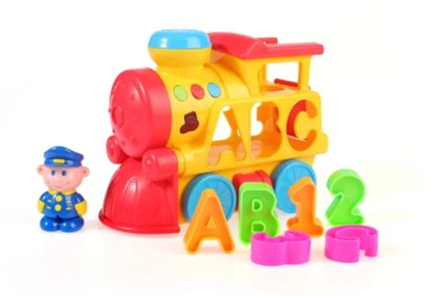 Vláček je na kolečkách, takže ho může dítě vozit po podlaze, dále má vkládací část, do které se vkládají tvary pismene A,B,C a čísel 1,2,3
