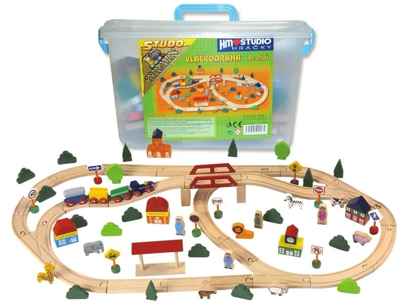 Dřevěná vláčkodráha 95 dílů – vyrobeno z kvalitního dřeva. Baleno v plastovém boxu