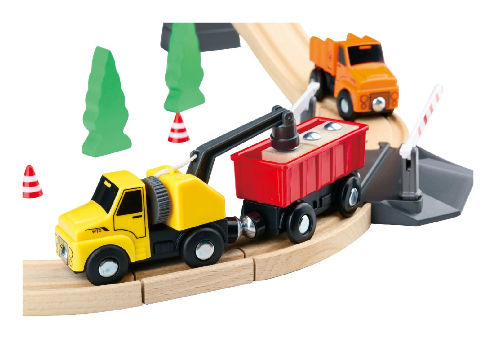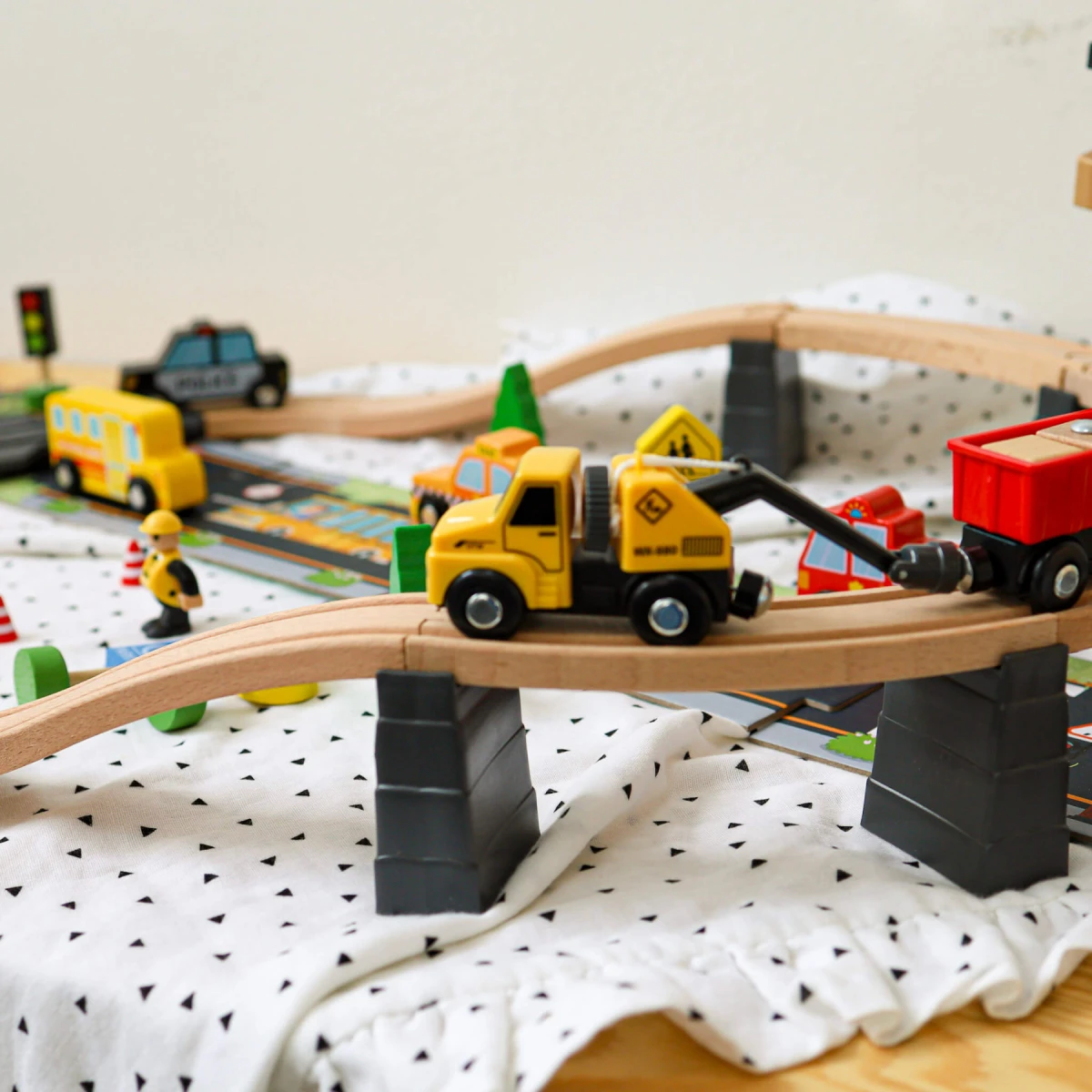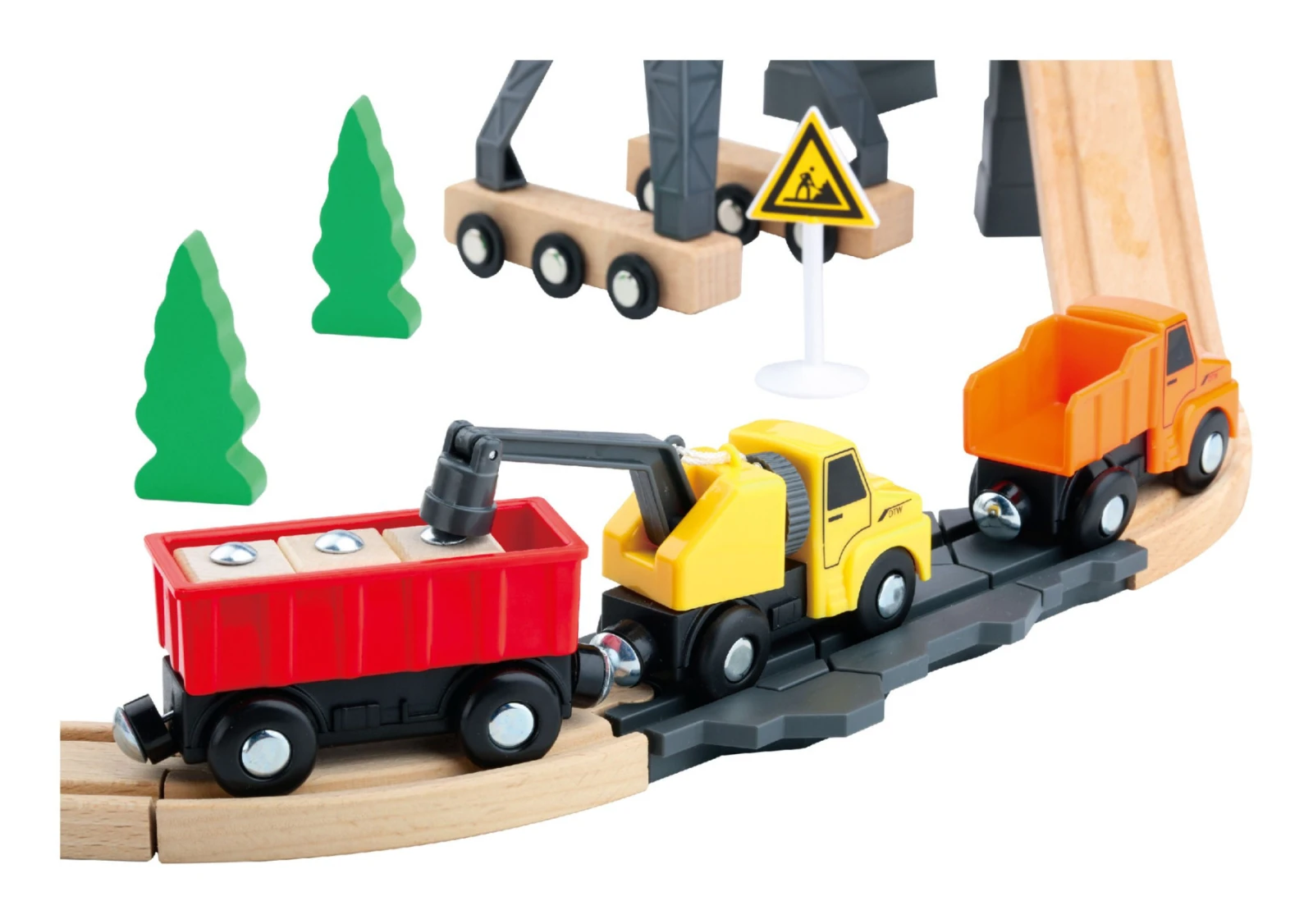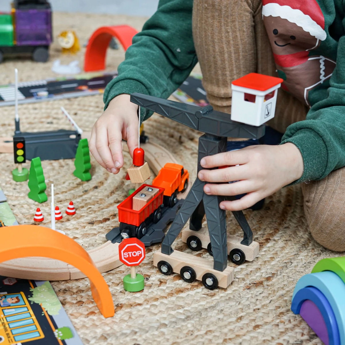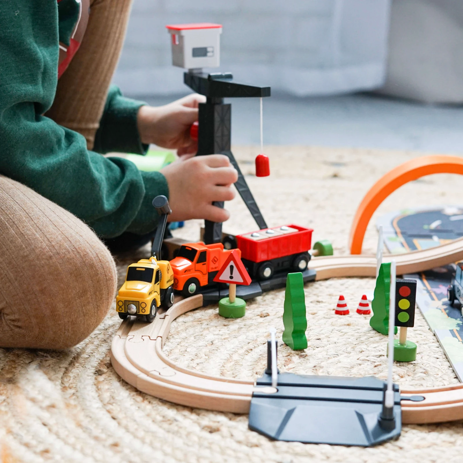 Jezděte s vozidly po trati a sledujte, jak se napojují na magnetické klouby. Obsahuje příslušenství jako otočný jeřáb, křižovatku, pracovníka, který ukazuje, kam mají vozidla jít.