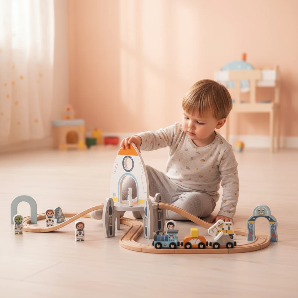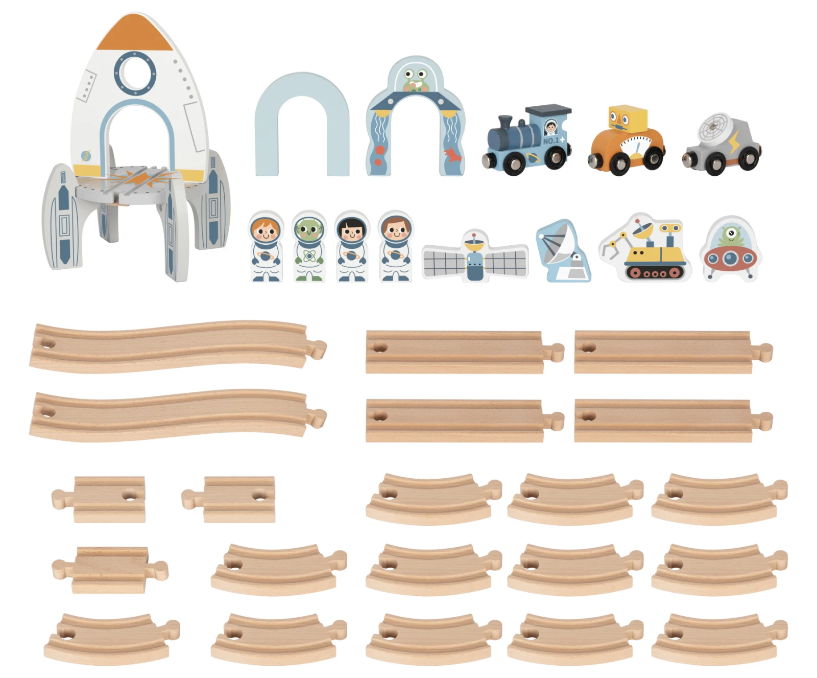 - Sada obsahuje dřevěné koleje, vlak se dvěma vozy, postavy astronautů a motivy jako UFO nebo raketa — vstupenka do světa za Zemí.
