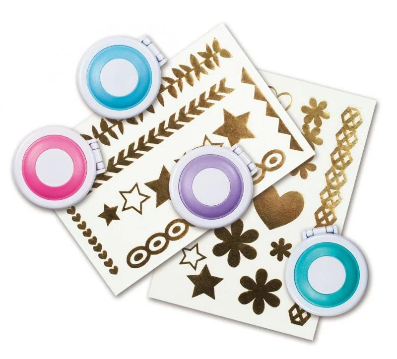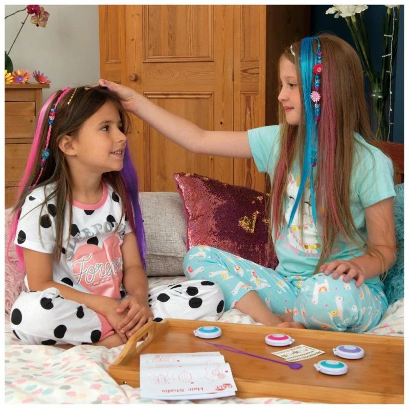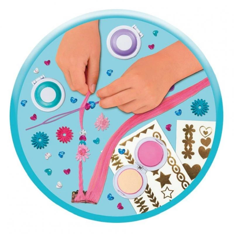 Obsah: 4 vlasové křídy, 3 barevné příčesky, 2 archy vlasového tetování, 40 korálků ve tvaru srdce, 6 textilních kytiček s korálkem, pomůcka pro navlékání korálků, 30 gumiček a návod.