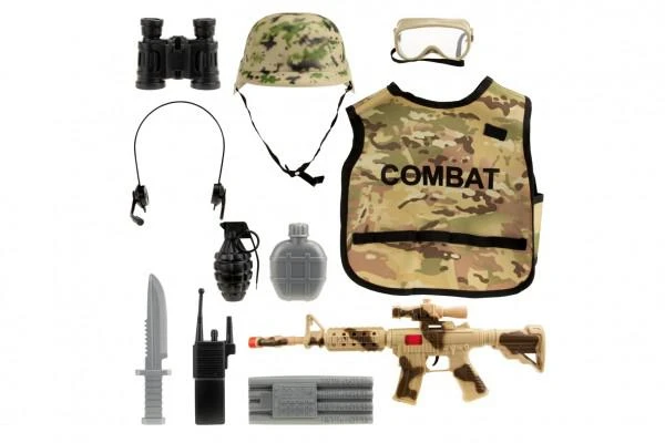 Vojenská souprava, se kterou si kluci mohou vyzkoušet autentický pocit vojáka nasazeného v akci. Sada obsahuje vestu, helmu, samopal a jiné nezbytnosti nutné k přežití.