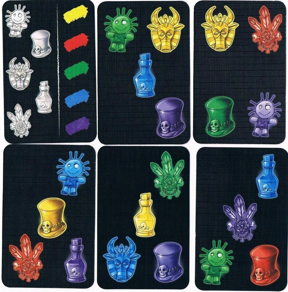 Každý hráč má dobírací balíček karet a tři karty v ruce. Ten, kdo se zbaví co nejrychleji všech karet, vyhrává. Když se to někomu povede, kolo končí a ostatní si započítají penalizaci za každou svou kartu. Na kartách jsou tyto symboly: maska, amulet voodoo panenka, lektvar, cylindr.