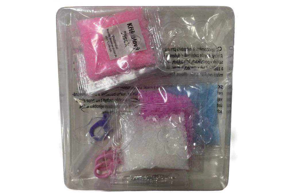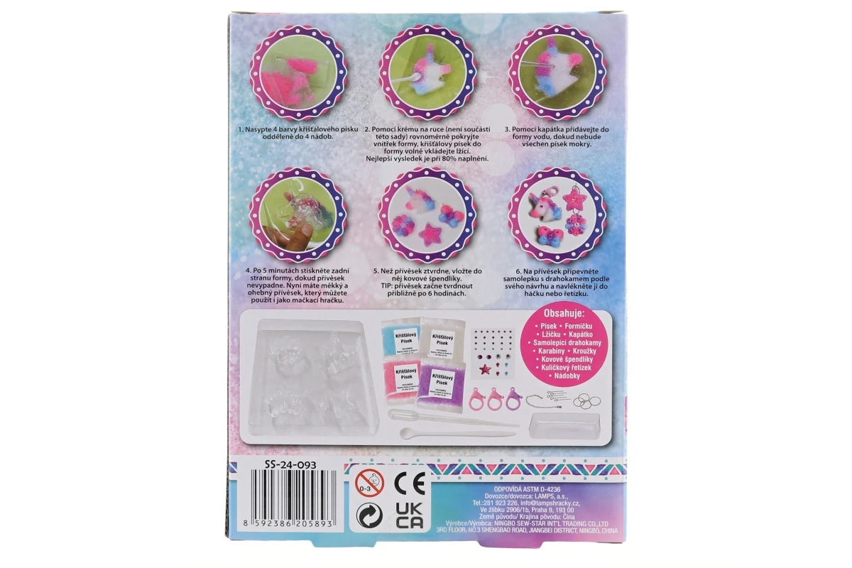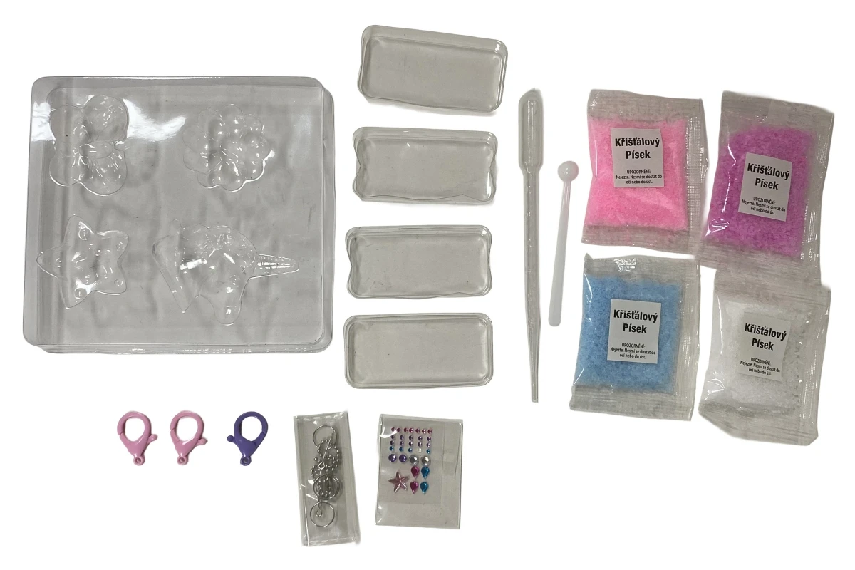 Kreativní sada obsahuje písek, formičku, lžičku, kapátko, samolepící drahokamy, karabiny, kroužky, kovové špendlíky, kuličkový řetízek a nádobky. Baleno v krabici.