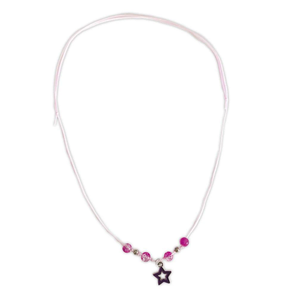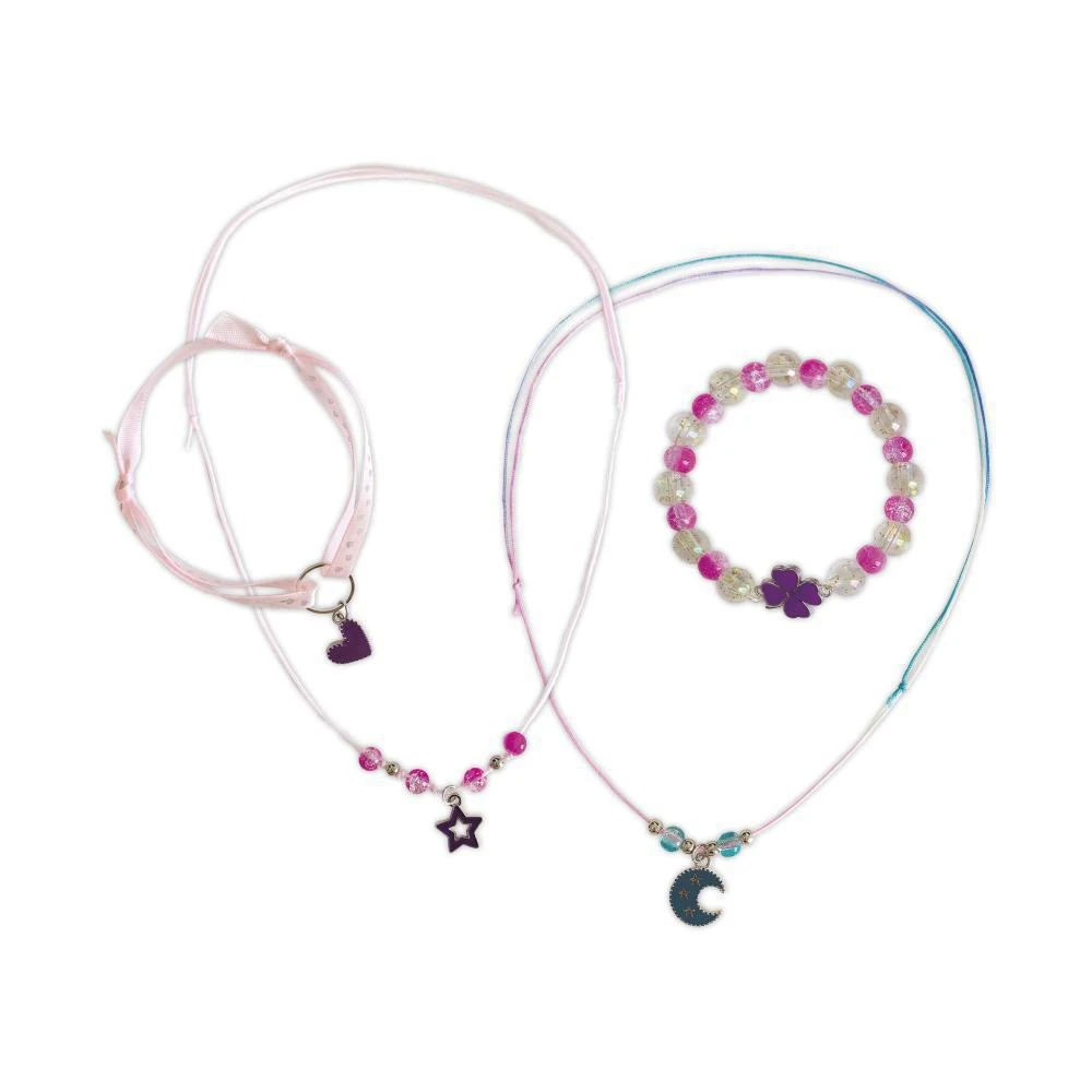 Z obsahu této kreativní krabičky si děti mohou vyrobit 2 náhrdelníky a 2 náramky: 4 kouzla, která mění barvu při kontaktu s pokožkou a teplem, 11 třpytivých korálků, 16 růžových korálků, 2 modré korálky, 6 stříbrných korálků, růžovou nit, duhovou nit a 1 stuhu s potiskem. Součástí je i brožurka s návody a vzory, které děti provedou celým procesem.
