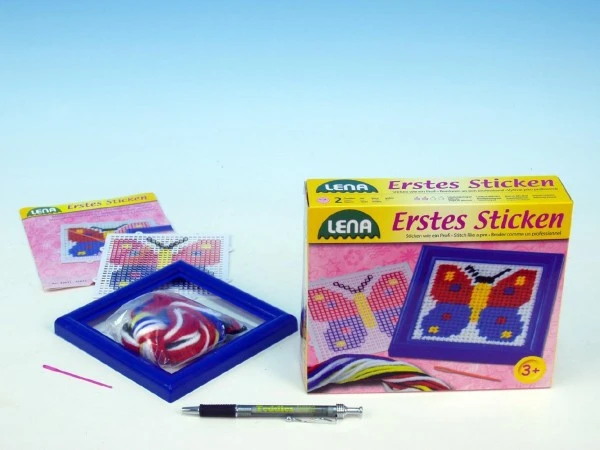 Obsah: 1 potištěná umělohmotná mřížka, 1 obrazový rám, barevná vyšívací příze, jehla a návod.