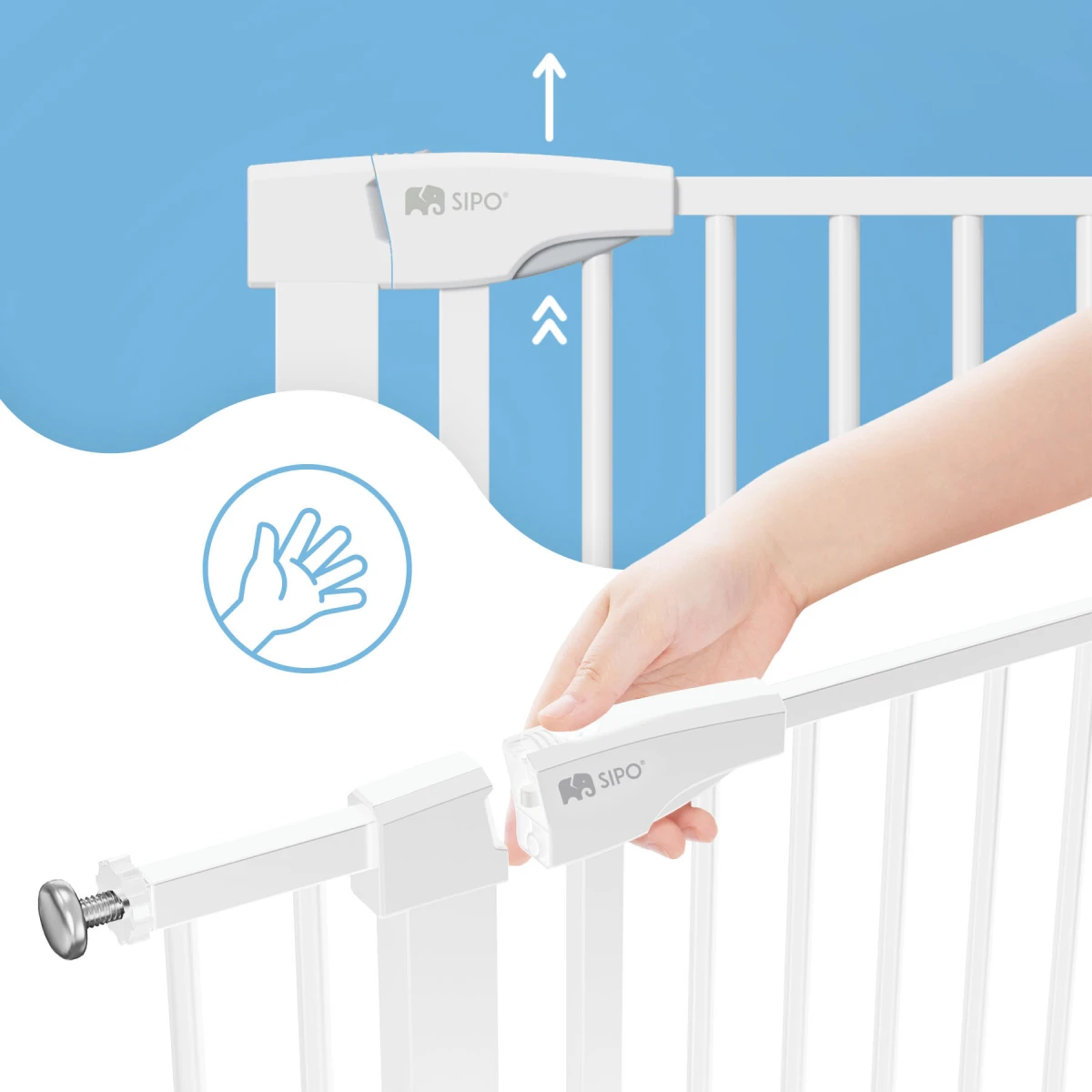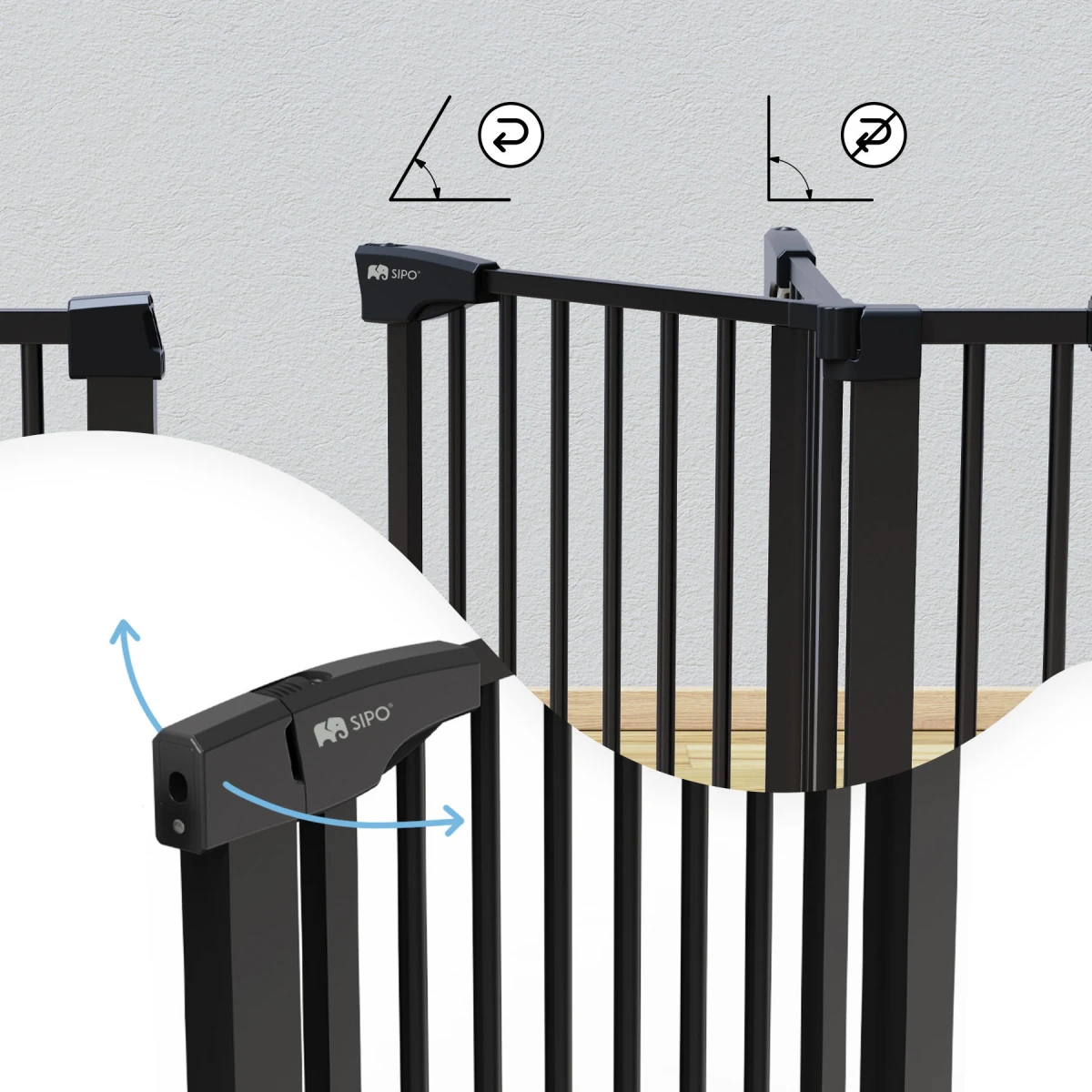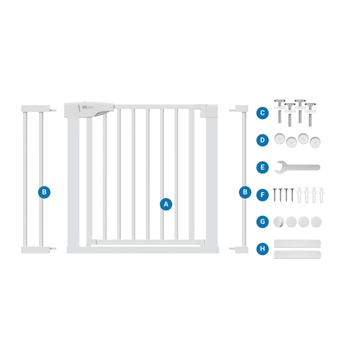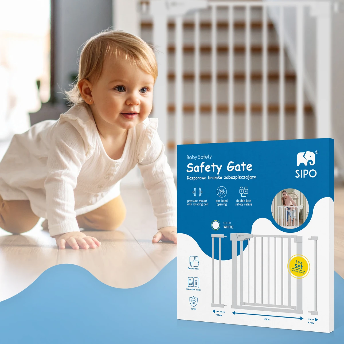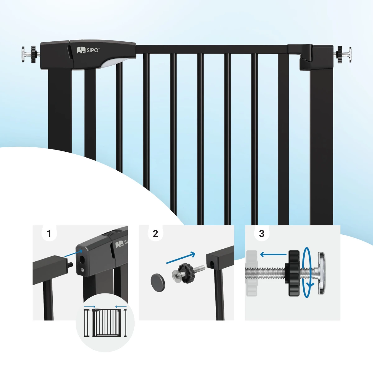 Sada skládající se z branky a kovového nástavce o šířce 7 nebo 14 cm je vhodná pro schody nebo dveře o šířce 75-103 cm. Díky nastavovacím šroubům ji můžete rychle a stabilně upevnit na místě.