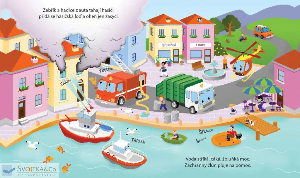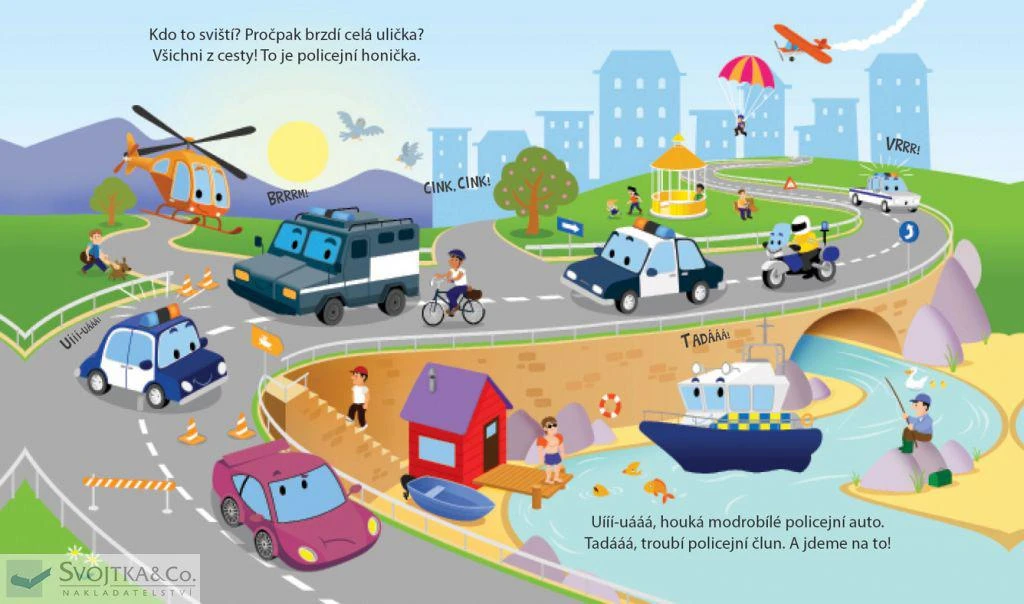 Uííí-uááá, houká modrobílé policejní auto. Tadááá, troubí policejní člun. Haúúú, houká sanitka - tahle interaktivní zábavná knížka s veselými celostránkovými ilustracemi obsahuje krátké, dobrodružné a rýmované příběhy. Ale hlavně - 18 parádních zvuků různých dopravních prostředků! Vaše děti si zamilují čtení příběhů doplněné o mačkání tlačítek se zvukovými efekty! Stačí jen najít odpovídající obrázek a stisknout… Ozve se siréna policejního nebo hasičského auta, sanitky a spousty dalších vozidel, která lidem v hrůznějších situacích pomáhají. Ale i v knížce jednou den končí; a tak dnes už žádné houkačky! Byl to moc dlouhý, rušný den a záchranářská autíčka nemůžou houkat pořád. Musí také spát, aby zítra mohla zase ven a pomáhat!