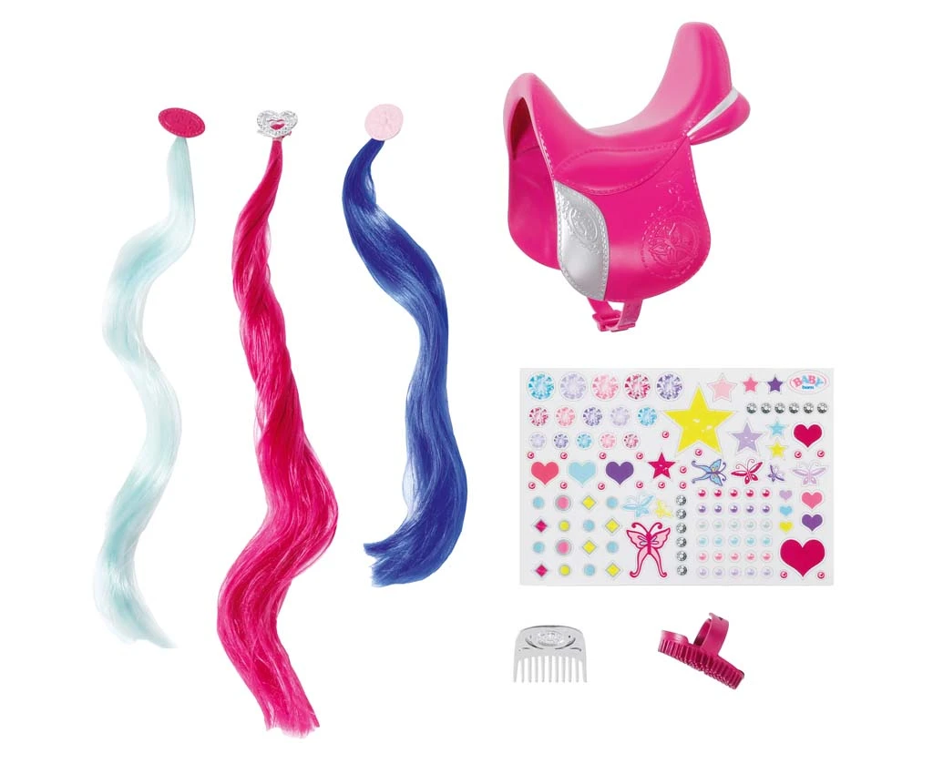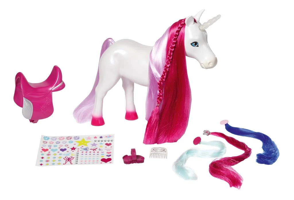 Balení obsahuje jednorožce, 3 barevné příčesky, kartáč, hřeben a samolepky.