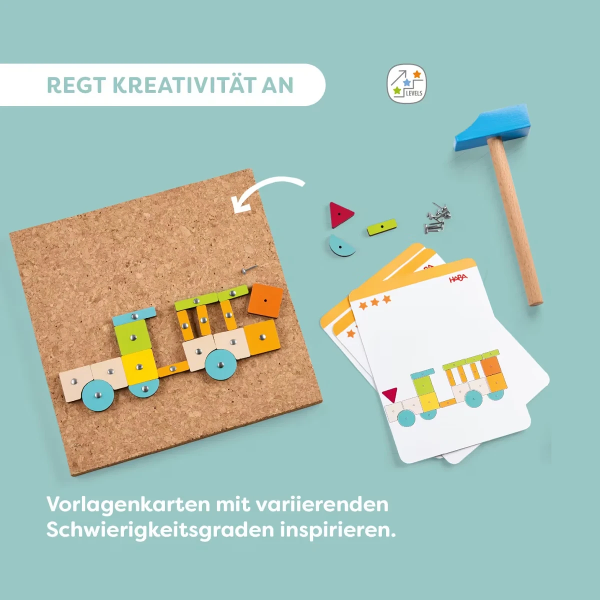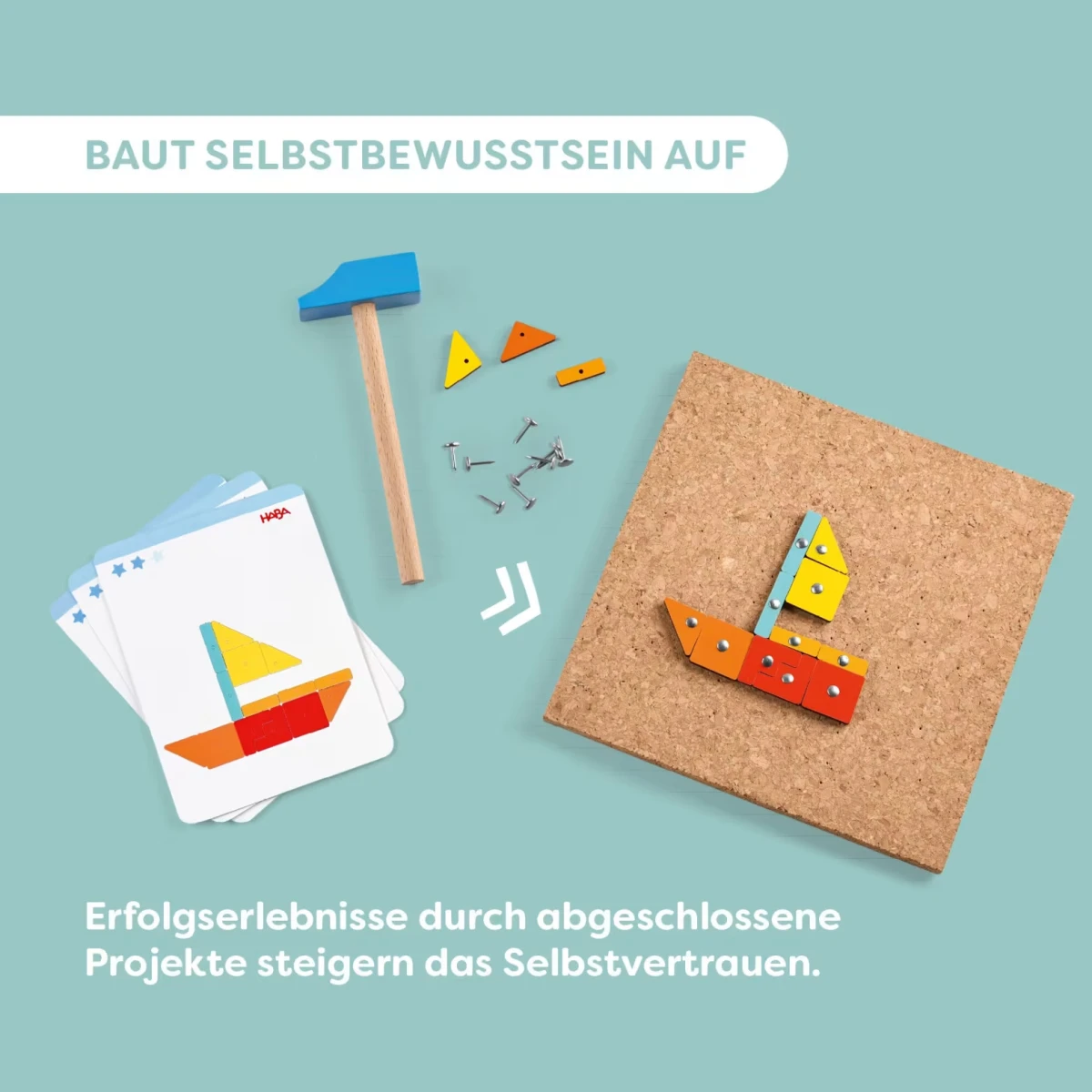 Pomocí trojúhelníků, kruhů, obdélníků a dalších tvarů vznikají pestré zvířata, rostliny i dopravní prostředky – buď podle předlohy, nebo úplně svobodně podle vlastní fantazie. Volné hřebíkování bez předlohy rozvíjí kreativitu a představivost.