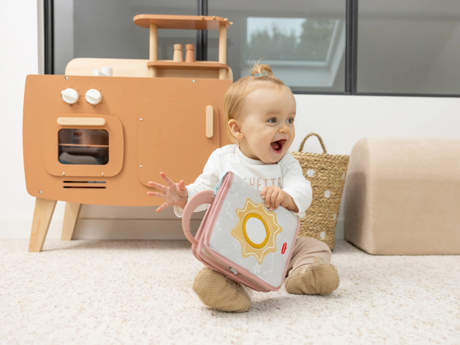 Knížka je ideální na doma i na cesty – snadno ji s pomocí závěsného kroužku připevníte ke kočárku, autosedačce nebo hrazdě na hrací dece.