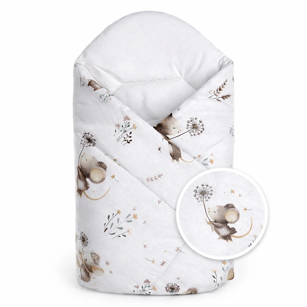 Rozměr cca 80 × 75 cm je ideální pro pohodlné zavinutí miminka. Povrch je vyroben z kvalitní 100% bavlny, která je jemná a šetrná k citlivé dětské pokožce. Vnitřní výplň z hypoalergenního dutého vlákna zajišťuje maximální komfort, tepelnou pohodu a bezpečné používání.