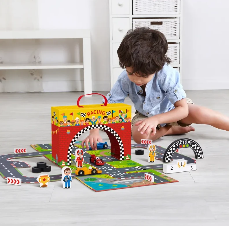 - Pouzdro obsahuje trať, auta, pneumatiky, figurky a další doplňky – kompletní sadu pro malé závodníky.