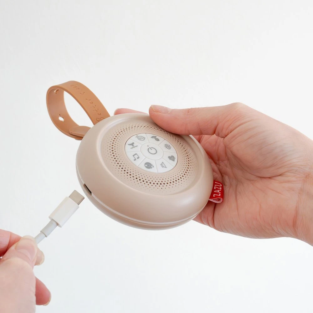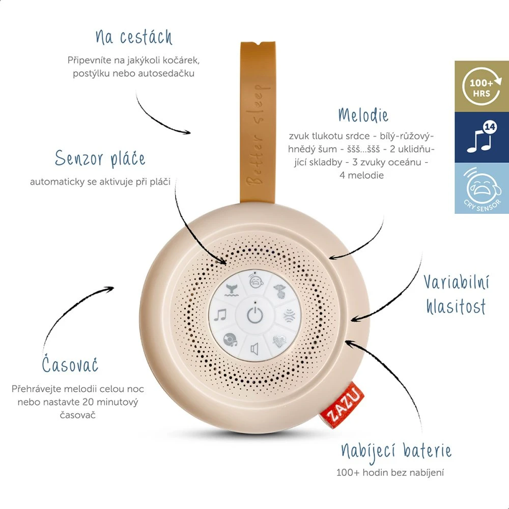 Přenosný uspávací modul nabízí 14 tišících melodií: Ššš...Ššš..., zvuk tlukotu srdce, bílý šum, růžový šum, hnědý šum, 3 zvuky oceánu, 2 uklidňující skladby a 4 melodie.