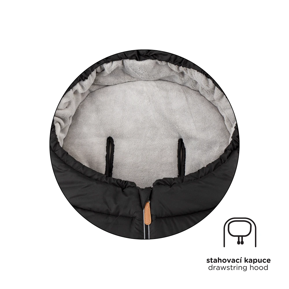 - Pomocí šňůrek ke stažení kolem hlavičky se vytvoří kapuce, která dokonale chrání dítě vůči větru a chladu.