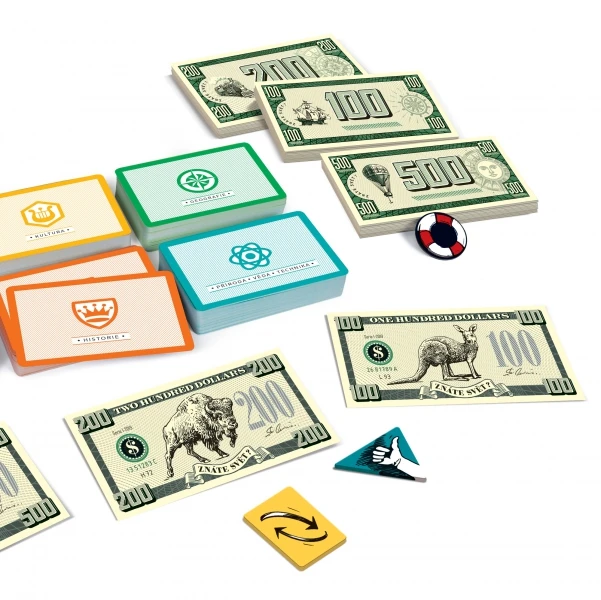 Hra Znáte svět? obsahuje: 450 karet s 1350 otázkami, 18 akčních žetonů, bankovky v hodnotě 100, 200 a 500 dolarů a pravidla.
