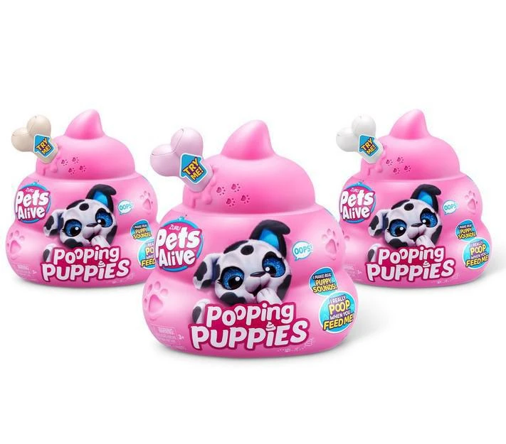 Nakrmte hladové chlupáče kostičkou a sledujte, jak jí vykakají v jiné barvě! Hračka vydává zvuky prdění při zvednutí tlapičky, rozkousávání kosti a další spojené s jezením při krmení či kňučení!