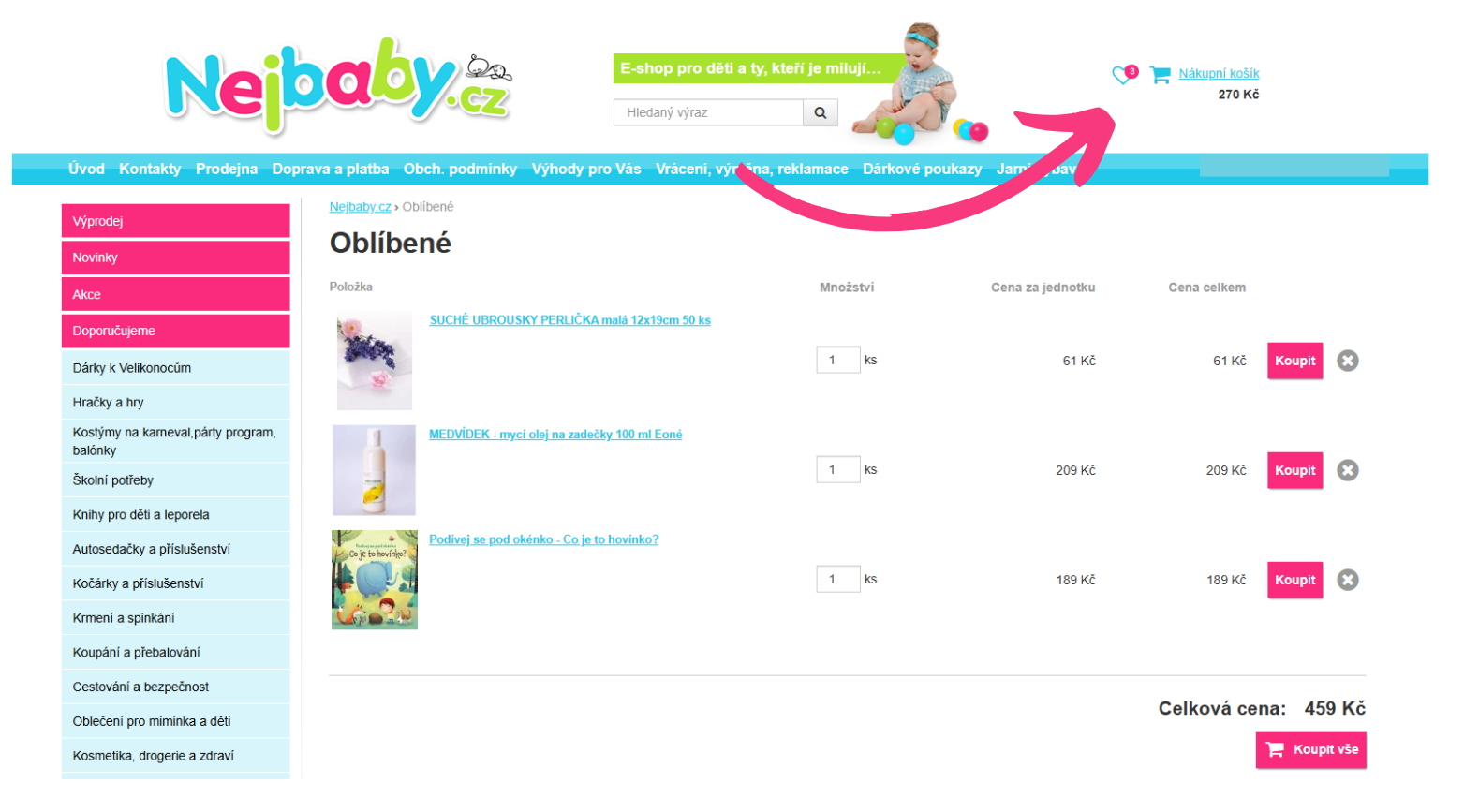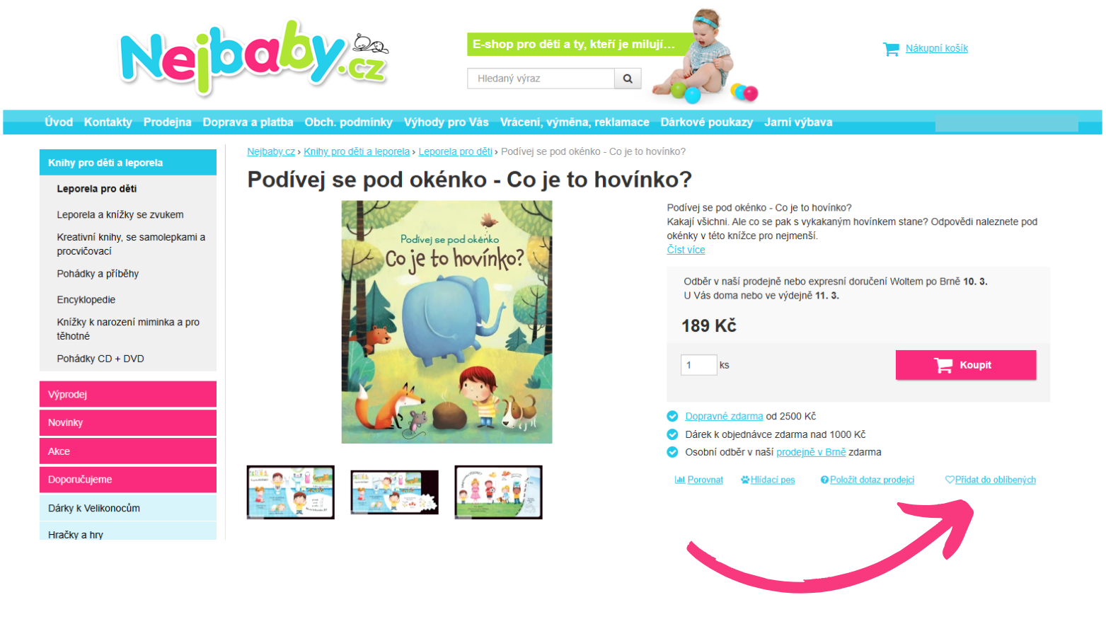 V detailu produktu naleznete tlačítko přidat do oblíbených. Když na toto tlačítko zmáčnete, daný produkt se vám přidá do nákupního seznamu.